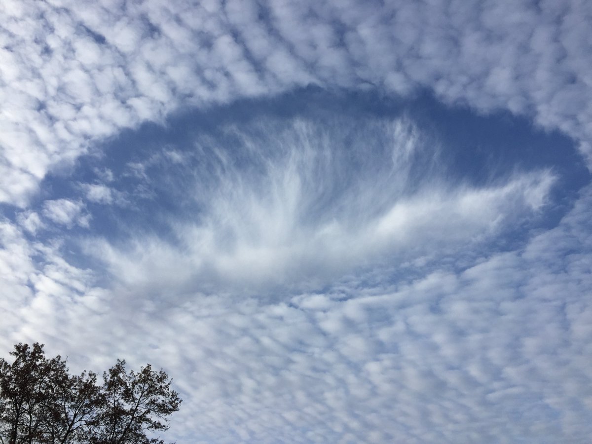 Such holes are formed when the water temperature in the clouds is below freezing but the water, in a supercooled state, has not frozen yet due to the lack of ice nucleation. When ice crystals do form, a domino effect is set off due to the Bergeron process, causing the water droplets around the crystals to evaporate: this leaves a large, often circular, hole in the cloud.