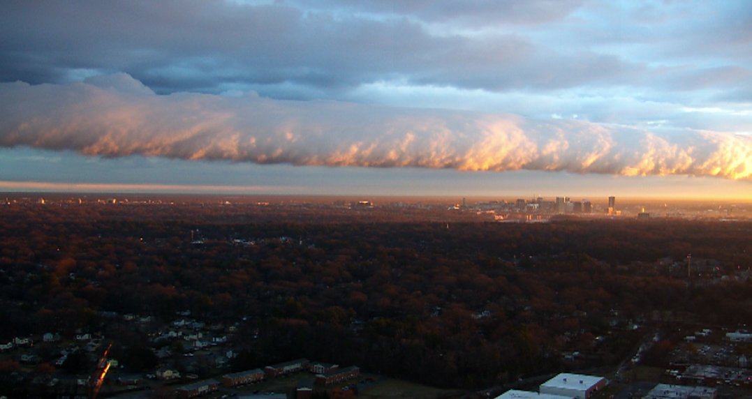 This is called a roll cloud or gust front which was seen in Richmond Virginia. It is the combination of rising warm air and sinking cold air which gives it a rolling look. A roll cloud is usually seen with severe weather, but that was not the case here. This roll cloud was the leading edge of a very weak or “dying” front.