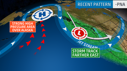 The ridge in the jet stream is a symptom of the negative phase of the Pacific North American pattern, which has been holding over the continent for several weeks.