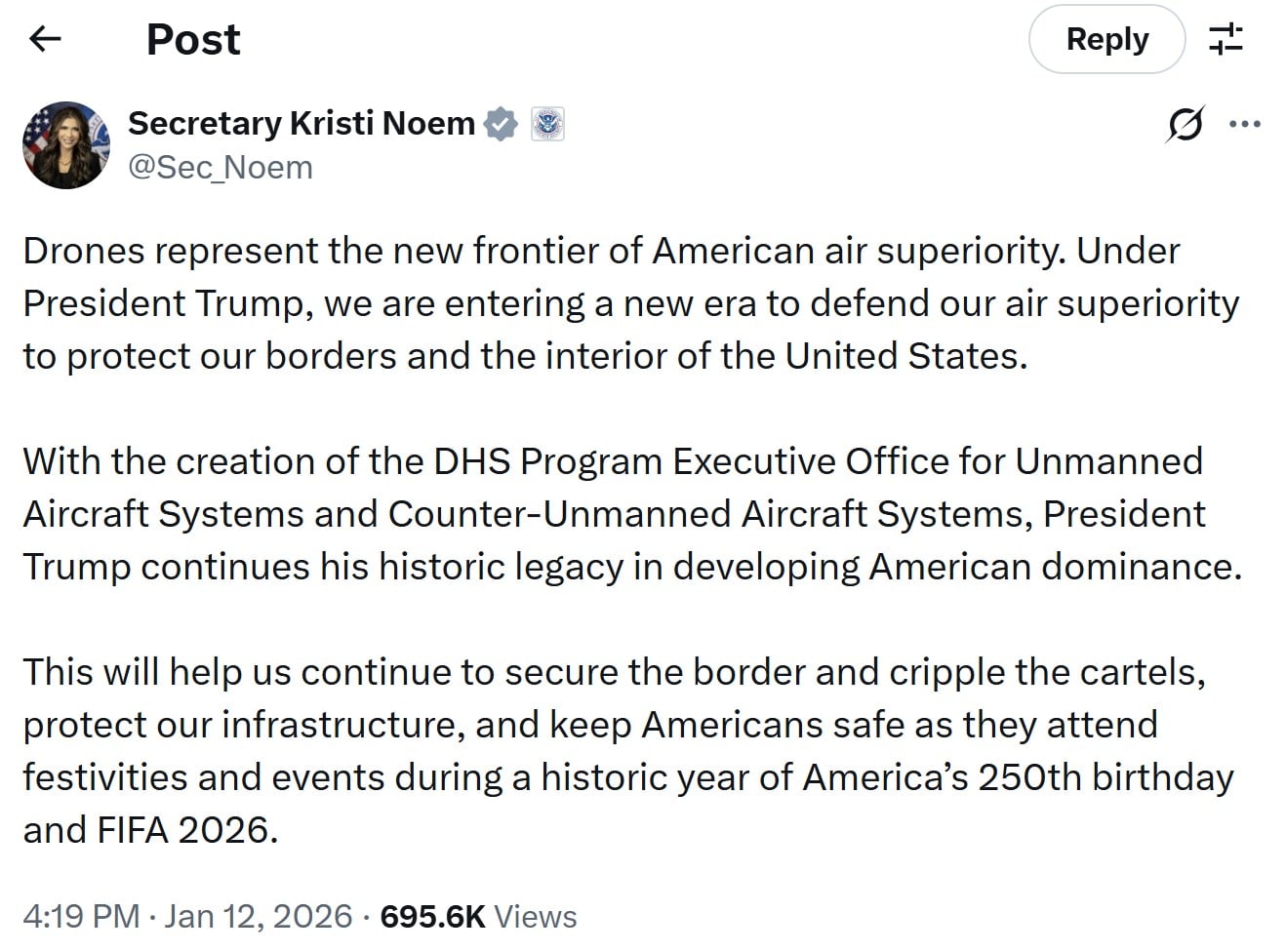 DHS Secretary Kristi Noem described drones as “the new frontier” of American air superiority, not just at borders, but across the country. DHS also announced the creation of a Program Executive Office for Unmanned Aircraft to manage this new rollout.